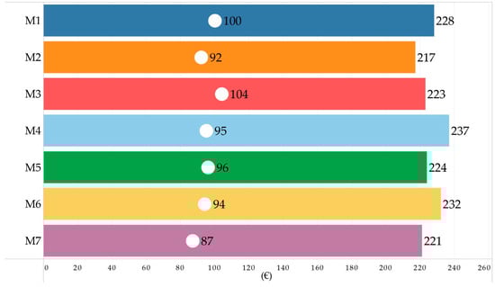 Average dispenses per person or household depending on the market brand. M1 = AV Vasilopoulos, M2 = Masoutis, M3 = Galaxias, M4 = LIDL, M5 = My Market, M6 = Sklavenitis, M7 = other markets, where “other markets” represent small retail shops, not well-known.