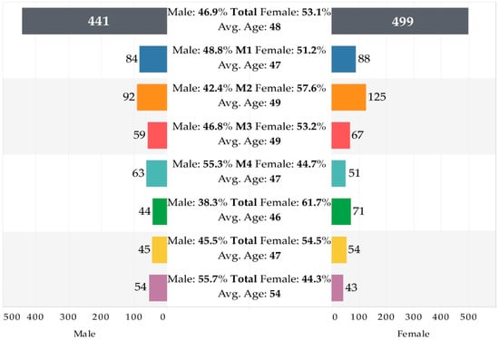 Figure 3 presents the participants’ responses on the main market depending on their gender. The average age of the respondents–consumers of each one of retail chain stores is 48 years old (±1 year). The overall sample characteristics indicate that there is an equal amount of men and women participated in the survey. The only exception is the customers of small, corner supermarkets (M7) that are evidently older (average age 54 years old). Regarding the gender ratio of the participants of the survey, in six out of seven stores is almost 50–50, while in the case of M5, females were slightly more (62%) than males (38%).