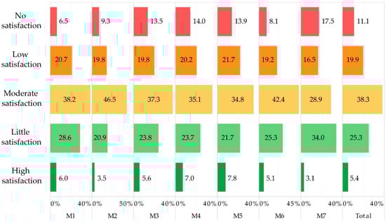 In terms of educational level, the distribution of customers of the M1 market differs from the sample as a whole, as it presents a significantly higher percentage of higher education graduates (p-value < 0.01), while the “other markets” (M7) accumulate categories of customers with lower educational level. This result can be characterized as expected when combined with the age parameter, since, as mentioned above, the majority of customers of these stores are mainly elderly people. Figure 4 presents the classification of customers per supermarket, applying the satisfaction level regarding the customers’ monthly income as a criterion. The satisfaction flowchart follows the same trend in every retail store, providing hints of high competitiveness among firms in this sector.