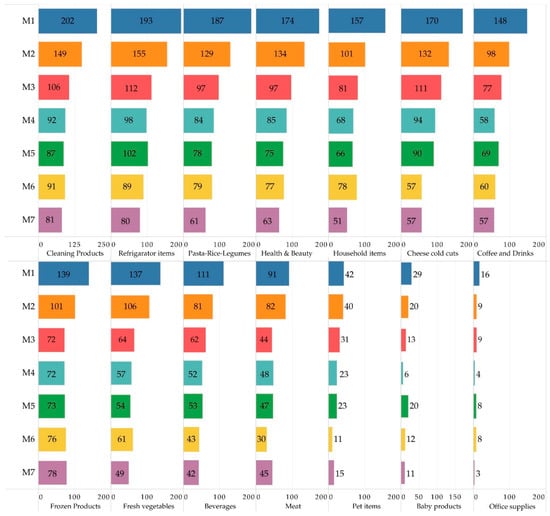 M1 chain presents statistically significant differences for several categories of the total sample. In fact, in the category of cleaning products, there is a very strong statistical difference (p-value < 0.01) in relation to the total sample. The percentage of customers procuring meat from the M2 chain is higher (48%), compared to the other chains (41%) (p-value < 0.05)). Those who buy household goods and pasta/rice/canned food from M1 are more, with a statistically significant difference when compared with the other six stores. The percentage of those who buy health and beauty products, drinks and coffee, and fresh fruits and vegetables from M1 is also higher than the corresponding percentages of other supermarkets (p-value < 0.05). M3 retail shop customers buy more cheeses and cold cuts than the average (88.1% versus 79.9% of the total), with a statistically significant difference. On the contrary, less pasta/rice/canned food is sold from M5 store (67.8%, compared to 76.1% of the total), while the same applies to fresh fruits and vegetables (47%, compared to 56.2% of the total) (p-value < 0.05).