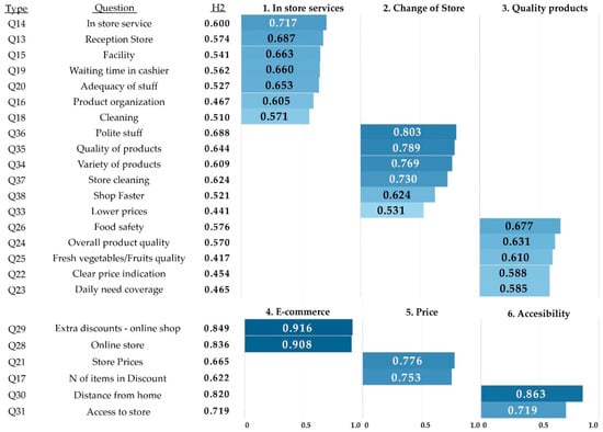 The results of PCA highlighted the six most important factors influencing supermarket selection. In store services, including facilities, product organization, cleanliness of the store, and staff adequacy have been denoted as the most significant factors. These results are in full agreement with previous research [42], which points out that consumer preference in the store is closely linked to service provided and comfortable facilities of the retail store. In addition, customers are looking for a store where the waiting time at the checkout is as minimum as possible, being this one of the motives for further development of e-trade. As stated in the literature review [43], even in physical stores, consumers prefer express counters in order to save time. The issue of time also appears in the second component, proving it is of great importance for consumers.