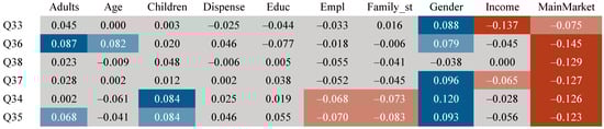 Correlation of socioeconomic characteristics with the retail shop selection criteria. Q33: “I am interested in cheaper prices of supermarkets” Q34: “I’m interested in greater variety of products in the retail market.” Q35: “I am interested in better quality products of the supermarket.” Q36: “I am interested in a retail market with more polite staff and better customer support.” Q37: “I am interested in the cleanliness of the store.” Q38: “I would like to have the opportunity to make purchases faster”.