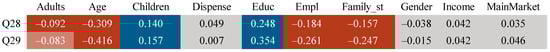 Figure 8 presents the correlation among answers for Q28 (willingness to buy from an online store) and Q29 (incentive of extra discount for online purchases) questions and socioeconomic characteristics of interviewees. There is a statistically significant difference in the responses of individuals of different educational levels, and as was expected, more educated people have a more positive behavior toward the use of e-commerce for shopping in supermarkets. A negative correlation is found from the comparison between age and the future use of e-commerce (p-value < 0.01). Employment, marital status, and the number of children influence the answers to these two questions statistically significantly (for employment and marital status p-value < 0.01, and for the number of children p-value < 0.05). It is therefore concluded that married individuals with children and unemployed respondents were more positive about using e-platforms for supermarket items and using this means of shopping with the motivation of lower prices. In contrast, there is no statistically significant difference in the correlation between usage on e-platforms and criteria such as gender, monthly income, shopping expenses, and type of market usually chosen.