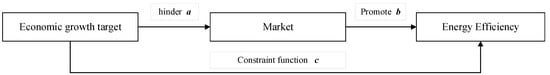 Driven by economic growth targets, China’s rapid economic development has been accompanied by increasing energy consumption and total carbon emissions. The conflicts between the environment, energy, and economic growth are becoming increasingly prominent [1,2]. This energy consumption, which is dominated by fossil energy, has brought serious environmental pollution to China. Among the pollution sources, China’s wastewater, sulfur dioxide, haze, and carbon dioxide emissions are the highest in the world [3]. Having low energy efficiency not only wastes limited energy supplies but also causes a sharp increase in carbon emissions [4]. In order to achieve sustainable economic development and fulfill the international commitments stipulated in the Paris Climate Agreement, the Chinese government has set a series of development goals to reduce energy consumption and carbon emissions. For example, by 2030, China’s energy consumption will be below 6 billion tons of standard coal [5]. Simultaneously, in order to combat global warming, a commitment was made to achieve peak carbon levels by 2030. China, as the world’s largest consumer of energy, is a major source of carbon emissions [6]. However, improving energy efficiency is a crucial way to achieve the carbon peak target. Energy efficiency improvements will reduce energy use, thus solving the energy dilemma in general [7]. Furthermore, improving energy efficiency has become one of the crucial objectives of energy and climate policies, as well as a fundamental way to ensure energy security and sustainable development [4,7]. Market-oriented economic structural reforms can help promote factor market development, which can be further improved to achieve the fundamental role of market mechanisms in resource allocation [8]. With the improvement of marketization, the flow of factors becomes more rapid, and advanced energy-saving and emissions reduction technologies can also be popularized on a large scale and quickly, thus improving energy efficiency [9]. However, under the special institutional background, the constraints of economic growth targets set by governments at all levels in China will affect the operation of the market, which will have a significant impact on marketization. In the past, many local governments took the typical approach of hard constraints on economic growth targets [10].