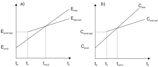 At the point of time tcrit,E, when Etotal = Etotal,repl, a product in use and a product considered to replace the product in use, have the same ecological impact. At a point of time later than tcrit,E, a new product as an alternative to a product in use would lead to a lower ecological impact. Similarly, another point of time tcrit,C, can be determined. This is shown in Figure 1.