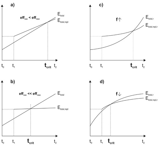 The required input power of a product is theoretically constant during its lifetime. In this way, the cumulative energy consumed during a certain time increases linearly as a function of time. Any change in energy consumption required to keep the product functional, e.g., due to component wear or loss and aging of lubricants, will gradually have an effect and increase the environmental impact of the product. The environmental impacts from Section 2.1 do not include wear or fatigue of components, aging of lubricants, etc., to keep the approach presented independently of the type of energy-related product and its technology. However, if such additional influences are considered when applying the presented approach, increasing demand for energy required for the intended function of the product can be considered by a correction factor in Equations (3) and (4). Then the influence of these kinds of effects over time must be determined, described by a function, and this function must be added to the previously mentioned equations. In addition, the point of time of tcrit,E depends strongly on the difference between the energy efficiency of both products and the energy used to manufacture the products. The less energy consumed to manufacture the product and the more efficient the product that is considered a replacement for the product in use, the earlier tcrit,E occurs.