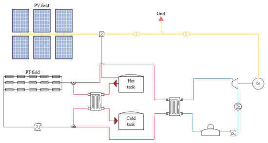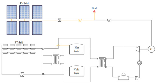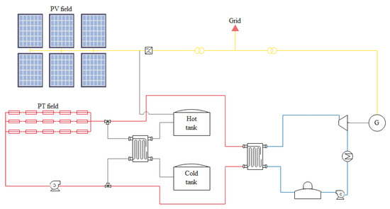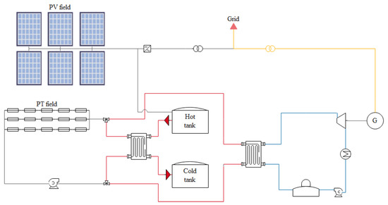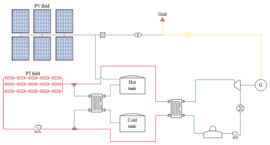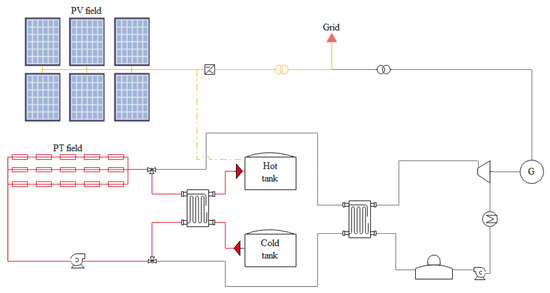 The PV output is inverted into AC and can be sent either to the grid and/or to the TES. In Figure 1, we present an overview of the hybrid solar plant configuration.