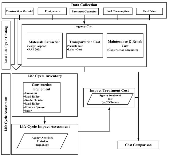 Santos, et al. [18] conducted LCCA considering the agency and user costs, which included delays due to the work zone and crash costs. During LCCA, the international roughness index (IRI) was used as an indicator to measure the performance of the pavement, which also helps in the estimation of pavement service life. It was concluded that using reclaimed asphalt pavement (RAP) can be helpful in the reduction of life cycle costs by approximately 20% as compared to conventional pavements. Similarly, Santos, et al. [18] conducted a comprehensive cost analysis study wherein the economic advantages and disadvantages of RAP and conventional hot mix asphalt pavements were compared. The LCCA includes all the phases, starting from materials procurement, through to design production, construction, maintenance, restoration, transportation, costs in the work zone, and ending with the recycling phase. IRI was used in the study, which is frequently measured via many cost analysis studies, whereby it was concluded that utilizing RAP impacts the reduction of agency and user costs depending on the rutting and cracking performance of the pavement [19]. Moreover, Coleri, et al. [20] performed a simulation based on a mechanistic empirical approach to the life cycle performance and cost analysis of reclaimed and control asphalt pavement for a wide-ranging life cycle performance evaluation, intended to investigate ensuing pavement preservation interventions and related life cycle cost components [20].
