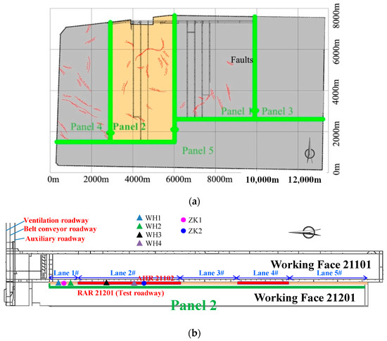 Roadway location and mining relationship. (a) General mining layout of Hulusu coal mine (reproduced from literature [18]); (b) geological conditions and layout of the test areas.