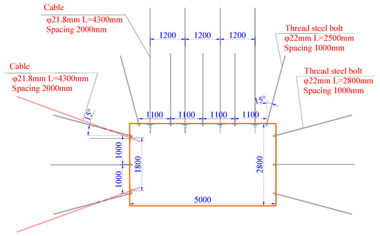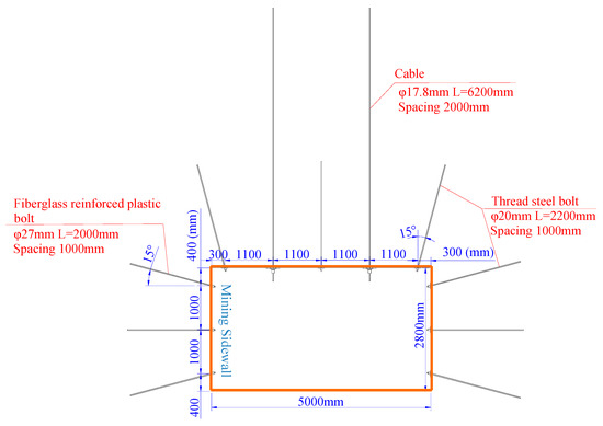 As shown in Figure 2, the roof of AHR 21102 is supported by “blot + cable” at stage of excavating. The roof is supported by five Φ 20 × 2200-mm left-hand threaded steel bolts. Moreover, the bolts in the left wing and right wing had an indentation of 15° and the rest were installed vertically. Each bolt is anchored by one MSCK 2370 mm resin coil and the pretension of bolt is 60 kN. In addition, two Φ 17.8 × 6200 mm cables are arranged for two rows of anchor bolts in each interval as the reinforcement support. All the cables were installed vertically on the roof of the roadway. Each cable was anchored with two MSCK 2370 mm resin coils, with pretension of 130 kN. Furthermore, the inter-row spacing of the bolts and anchor cables is 1100 × 1000 mm and 2200 × 2000 mm, respectively. Each row of non-mining side of roadway is supported by three Φ 20 × 2200 mm left-hand threaded steel bolts and the row spacing between bolts is 1000 × 1000 mm. Besides, the top angle and bottom angle of coal side are installed with 15° inclination and the rest bolts are installed vertically to the rock surface. Each bolt is anchored by one MSCK 2370 mm resin coil and the pretension of bolt is 30 kN, and each row of mining side is installed with three Φ 27 × 2000 mm glass fiber-reinforced plastics bolts. Finally, the inter-row spacing of the bolts is 1000 × 1000 mm, and the pretension of the bolt is 12 kN.