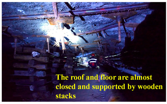 Affected by the mining stress of the working face 21102, the AHR 21102 has a large deformation, and different roadway sections show different degrees of section contraction. The full section of roadway lane 2 and lane 4 (Figure 1) is pressed and shrinks violently, and the roof and floor of some sections are almost closed, relying on the wooden crib support (Figure 3), so it cannot be used as the return air roadway of the working face 21201. Although the surrounding rock of lane 1, lane 3, and lane 5 roadway section has large deformation, the stability structure of surrounding rock still exists.