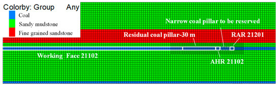 The finite difference FLAC3D numerical model is established based on the working face 21102, AHR 21102 and RAR 21201 with a coal pillar along the 21102 auxiliary haulage roadway. The model length × width × height = 270 m × 120 m × 78 m (Figure 5). The width of 21102 working face is 165 m (half, actual width is 330 m), and the dimensions of 21102 auxiliary haulage roadway and 21201 return air roadway are width × height = 5 m × 2.8 m (according to the actual cross-section size of roadway). In order to ensure the calculation accuracy, the grid of roadway and coal pillar area is designed to be densified. The upper end of the model is a free surface with a vertical load of 15 MPa (calculated according to the actual buried depth of 626 m). Besides, the displacement boundary conditions are applied both around and at the bottom of the model. The bottom boundary of the model is fixed in the vertical direction, while the left and right boundaries fixed in the horizontal direction to eliminate the displacement. Besides, the model adopts the Mohr-Coulomb yield criterion, and the physical parameters of rock stratum are shown in Table 1; the text related to Table 1 and the caption should clearly state the parameters were taken from [18,19,20] and that they represent rock mass properties while considering the effect of cleat networks in the coal seam.