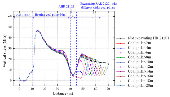 It can be concluded from Figure 6 that: (1) the 30 m residual coal pillar work is in cooperation and linkage with the protective coal pillar of the RAR 21201. When the width of the protective coal pillar is small (e.g., 2 m, 4 m, 6 m), the vertical stress above the 30 m residual coal pillar is higher than that when the RAR 21201 is not excavated, and the vertical stress above the corresponding protective coal pillar is lower than that when the RAR 21201 is not excavated; (2) with the increase of coal pillar width (2 m~10 m), the width of elastic core area in the coal pillar increases and begins to undertake higher concentrated stress, which makes the concentrated stress above the 30 m residual coal pillar decrease; (3) when the width of the coal pillar increases to a certain range (10 m~20 m), the RAR 21201 enters into the original rock stress area by avoiding the stress rising area, which is formed in the lateral solid coal after mining in the 21102 working face of the upper section. Therefore, the vertical stress above the coal pillar has a decreasing trend, at this time, the vertical stress above the 30 m residual coal pillar also gradually returns to the state when the RAR 21201 is not excavated; (4) the width of coal pillar should be less than 8~10 m when considering the pressure relief effect of surrounding rock caused by severe deformation of AHR 21102.