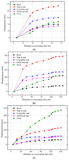 (1) Within the range of 30~50 m away from the excavating face, the monitoring results of the four stations show that the deformation of two ribs and roof subsidence increase rapidly, showing a linear growth trend. When the distance between the station and the excavating face exceeds 50 m, with the weakening of the dynamic pressure disturbance, the deformation decreases significantly, then tends to be stable, and finally enters the rheological period. After stability, the maximum deformation of the middle point of the roof is 35~70 mm, and the maximum displacement of two ribs is 161~244 mm. In addition to the station of WH1, the deformation of coal pillar side is slightly larger than that of solid coal side.