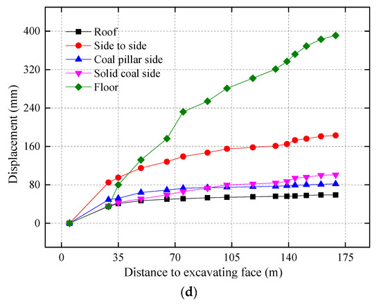 Surface displacement of the RAR 21201 versus distance to excavation face. (a) The monitoring results of WH1 station; (b) the monitoring results of WH2 station; (c) the monitoring results of WH3 station; and (d) the monitoring results of WH4 station.