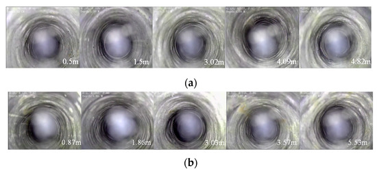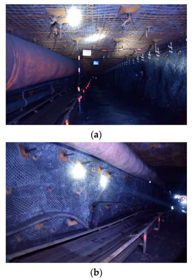 (1) At present, RAR 21201 has been excavated for nearly 700 m. Due to the different deformation degrees of roadway lane 1 and lane 2, the two roadway sections of RAR 21201 have shown obvious differences in construction. In the roadway section corresponding to lane 1, the surrounding rock structure of AHR 21102 has not been completely destroyed, and the roof stress has not been fully released. Meanwhile, the protective coal pillar of RAR 21201 still bears large stress, resulting in the strong mining pressure behaviors such as severe floor heave, frequent coal gun sound, hole collapse, and top drilling in the construction of coal pillar side. After entering the roadway lane 2, the severe deformation of the residual roadway effectively releases high concentrated stress of the roof, which informs a pressure relief effect on the surrounding rock. When excavating the RAR 21201, the floor heave, the frequent sound of coal guns, the hole collapse and top drilling in the construction of coal pillar side, and other strong mine pressure phenomena are obviously improved, which means the surrounding rock control effect is good (Figure 10).
