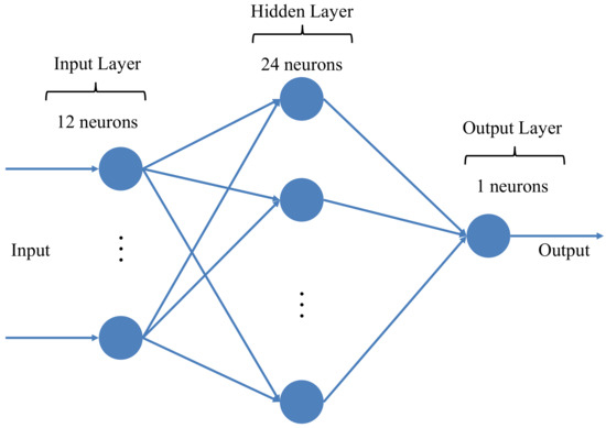 A BPNN is a multilayer feed-forward network trained according to the error backpropagation algorithm [27]. The BPNN is divided into the input layer, hidden layer (fully connected layer), and output layer. In the forward pass, the input signal is processed by the hidden layer to the output layer. If the output layer does not yield the desired output, it switches to backpropagation. According to the prediction error, it adjusts the network weights and thresholds in order to yield an output that is closer to the expected output. In this study, a BPNN was built based on the Tensorflow framework by setting the number of hidden layers, the number of neurons in each layer, and the neuron activation function. According to the characteristics of the input data of the neural network, the structure of the BPNN was determined to be 12-24-1; that is, the input layer dimension is 12, the number of hidden layer neurons is 24, and the number of output categories is 1, as shown in Figure 3.