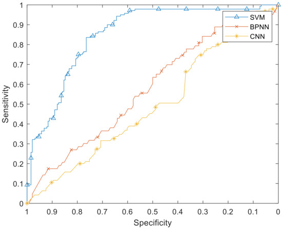 Receiver operating characteristic (ROC) curve of the support vector machine (SVM), backpropagation neural network (BPNN), and convolutional neural network (CNN).