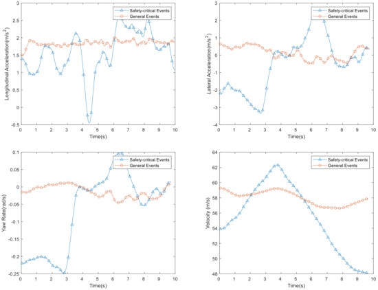 Furthermore, we used the sample data of naturalistic driving traffic events on mountain roads to analyze the basic characteristics of vehicle motion parameters under different levels of risk. After several analyses, the stability of longitudinal acceleration, lateral acceleration, yaw rate, and vehicle speed data showed a certain correlation with the risk level. The vehicle kinematics parameter curve for safety-critical events had lower stability, whereas the general events had higher stability, as shown in Figure 6. It is necessary to obtain a stability evaluation index to show that stability effectively reflects driving risk.
