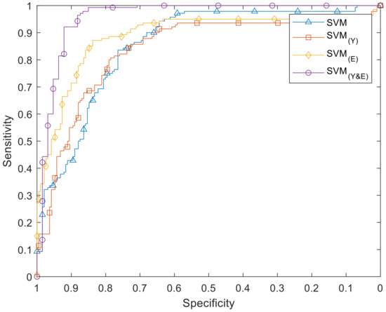 Receiver operating characteristic (ROC) curve of the support vector machine (SVM), SVM(Y), SVM(E), and SVM(Y&E).