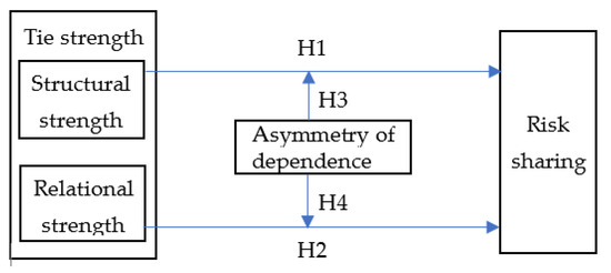 In practice, the asymmetry of dependence is prevalent in the connection relationships between manufacturers and suppliers, and the interdependence of symmetry is difficult to achieve. Especially in developing countries, as the majority of enterprises in these countries are more dependent on the other members in supply chains, though they contribute greatly to their economies [59]. This is because specific assets are asymmetric. For example, if a supplier wants to establish a trading relationship with a manufacturer, the supplier must invest in specific assets to meet the other party’s technical requirements and governance standards, and the investment proportion of specific assets is usually higher than that of the manufacturer. This causes the initial cost and the exit cost of the supplier to be significantly higher than the manufacturer, and the relative dependence on the manufacturer to be relatively high. Another reason is that information is asymmetric. The different resource positions of manufacturers and suppliers in the supply chain determine the asymmetry of information among enterprises. Generally speaking, manufacturers are more likely to obtain demand information in the downstream market while suppliers have more supply information of intermediate products and raw materials. when establishing and continuing transaction relationships, enterprises form an expectation of future events based on information, making trading decisions. The expectation bias produced by the asymmetry of dependence directly affects the trust and reciprocity between manufacturers and suppliers, as well as the depth and scope of resource and information exchange and integration [60], ultimately affecting the risk sharing among enterprises. Therefore, this study introduces the asymmetry of dependence as an important regulatory variable from the two dimensions of tie strength (i.e., relational strength and structural strength), and analyze the effect mechanism of the interaction between the asymmetry of dependence and tie strength on risk sharing.