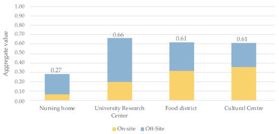 Figure 3 presents the overall results and the contributions of the two macro-areas identified for the evaluation concerning the on-site and off-site aspects. By considering this neutral scenario, the most adaptive alternative among the ones defined is the university research center (0.66), followed in second place by the food district and the cultural center, which obtained the same evaluation (0.61), while in last place, and with a consistent detachment from the first three, there is the nursing home (0.27). Weights were not assigned, therefore this result is not surprising since the nursing home had the lower scores compared to the other alternatives for all the criteria considered, while the university research center, as an average, performed with higher scores. By taking into consideration the partial contribution, the alternative that would have a more positive impact on the building (on-site) is the cultural center (0.35), while the one that would more positively influence the context (off-site) is the university research center (0.47). In order to assess the validity of the results and check their consistency and robustness, it is necessary to perform a sensitivity analysis.