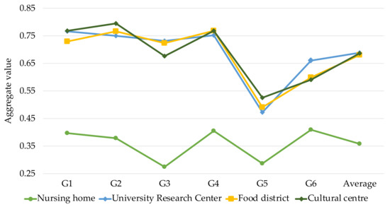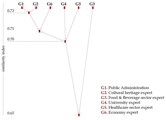 According to [28,77], to have an overall picture, it is important to better investigate the social compromise solution and the dendrogram to give validity and robustness to the results obtained. One of the most preferred alternatives is the cultural center, which was promoted by (G1) and (G6), and by (G2) and (G3), but they assessed it with the same scale as the food district, while for (G5) the university research center was present on the same level. Only (G4) did not judge in first or second place the cultural center, but rather in third, by assigning a higher evaluation to the university research center and the food district. The judgments were very similar with two exceptions, all the stakeholders agreed in evaluating the nursing home with a negative scale, while (G3) assigned it as(good) for the reasons previously explained, and the second refers to (G4), who evaluated the possibility of hosting a food district within the castle as (more or less bad).