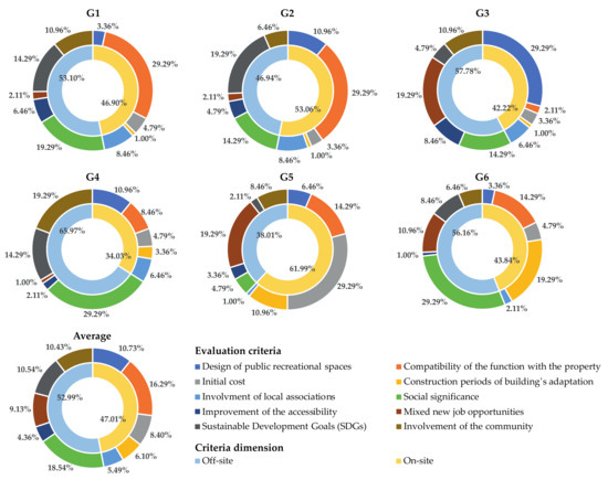 Within the off-site criteria, which are aimed at evaluating the possible impact of the adaptive reuse on the context, the catchment area measures the significance of the project and its attractiveness on the local (1), regional (2), and national (3) scale. The more attractive function is the university research center, since it can interest students from the whole country, while the others have an impact on the regional scale. It is also the only adaptive reuse that promotes the improvement of public mobility for the accessibility of the area and the one with the higher mixed new job opportunities, since it would involve a high number of job sectors, including professors, administrative staff, and different outsourcing services. Not all the Sustainable Development Goals (SDGs) are satisfied by any alternative under evaluation. Specifically, the nursing home is more focused on factors related to wellbeing and the sustainable use of natural resources (No 3, 6, 7, 9), the university research center promotes, moreover, the gender equity and good quality of education (No 4, 5, 7, 8, 9, 15), the food district considers responsible production and consumption by supporting the generation of sustainable cities and communities (No 2, 7, 8, 9, 11, 12), and the cultural center is the only one concerned with the relationship with the institutions (No 4, 10, 11, 16).