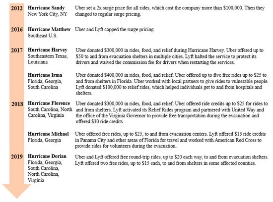 Ride-sourcing services are especially popular in metropolitan regions; data shows Uber and Lyft cars outnumber yellow cabs in NYC by 4-to-1 [68]. The feasibility and limitation of using ride-sourcing services for evacuation have been studied in the literature [3,5,6,7,8]. Researchers have provided extensive recommendations and guidelines to understand and develop more equitable evacuation by leveraging the sharing economy. Furthermore, ride-sourcing services have been active in many disasters in the United States and received positive feedback [6]. In 2012, when Hurricane Sandy struck NYC, public transportation was very limited for a large number of carless residents, and the demand for Uber rides was astronomically high [15,16]. In 2017, before Irma made landfall in Florida, Uber and Lyft offered free rides to and from shelters near Tampa [9,10]. In the case of Hurricane Harvey, also in 2017, Uber provided free rides to or from shelters in multiple cities [11]. In 2018, Uber and Lyft also provided free rides to and from shelters as Hurricane Florence approached [12,13]. Figure 1 summarizes the actions of Uber and Lyft during hurricane evacuations in the United States [5,9,10,11,12,13,14].