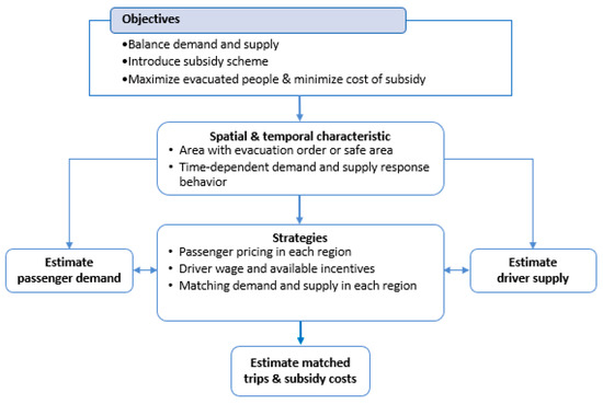 We propose a mathematical model designed to balance the demand and supply for ride-sourcing services in evacuations. The spatial characteristic of the model can provide different price settings in safe areas and evacuation areas. The temporal characteristic will quantify the proportion of people likely to evacuate in different time periods. The methodology framework is plotted in Figure 3. The bidirectional arrows indicate that elements interact with each other. For example, the price settings in the strategy box will affect demand and supply, which in turn will affect prices.