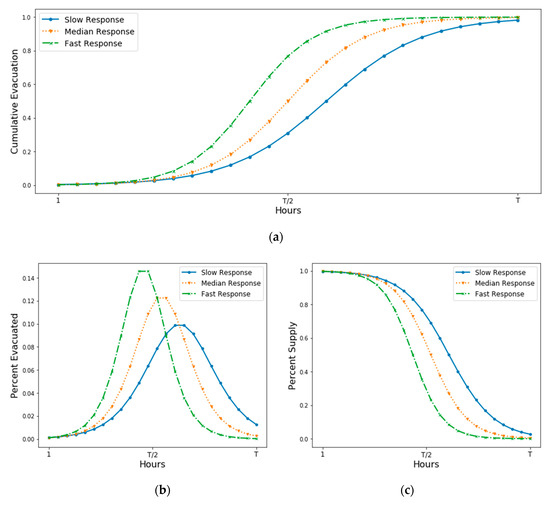 Examples of evacuation response curves by the logit model; (a) cumulative evacuation curves; (b) percent evacuated at each hour; (c) percent supply at each hour.