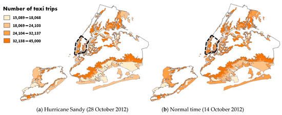 The number of taxi trips by pickup location in the evacuation zones; (a) the mandatory evacuation ordered on 28 October 2012 during Hurricane Sandy; (b) normal time two weeks before Sandy on 14 October 2012. (The highlighted area is the case study area located in Manhattan from 60th Street south). (Data source: NYC TLC data).