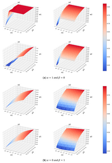 Assumption 1 requires that the density function is a decreasing function. Many commonly used distributions satisfy this assumption (e.g., uniform, exponential, Pareto). The joint strict concavity of also has a similar property. This shows that a higher passenger utility will lead to fewer passengers, while more service will be provided with higher wages. To simplify our analysis here, in the remainder of the paper we assume that Fb and are uniformly distributed on and , respectively. Similar assumptions for ride-sourcing services at regular times can be found in Bikhchandani [73] and Wu et al. [74]. Since we only focus on the application of ride-sourcing services, to simplify the model, the outside options are assumed to be 0 (). Then, we have the demand function in region :