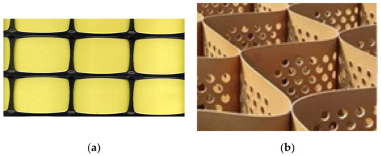 15] is a three-dimensional, permeable, polymeric (synthetic or natural) honeycomb, or similar cellular structure, made of linked strips of geosynthetics.