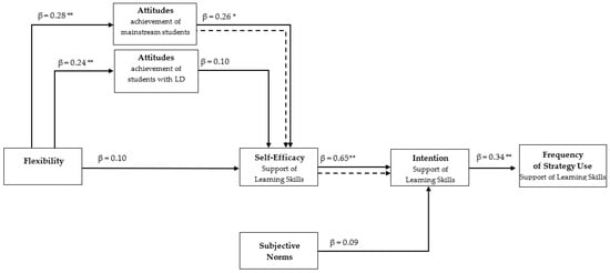 As expected, flexibility showed positive statistical effects on teachers’ attitudes towards the achievement of mainstream students and students with LD. This means that teachers, who are more flexible with regard to their job requirements, expect more positive outcomes of inclusive education concerning the academic achievement of students with and without LD. It seems reasonable that teachers who are more flexible in their conception of teaching can imagine different ways to assist their students in reaching the intended learning outcomes [7]. Hence, they may expect more positive outcomes for all of their students. As expected, the actual use of strategies supporting students’ learning skills was predicted by the intentions to use them, and indirectly via self-efficacy beliefs concerning those strategies. This is consistent with results of other studies that have investigated the influence of self-efficacy expectations on teachers’ behavior and instructional quality [24].