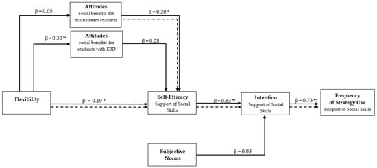 The specified model showed a good model fit ( = 12.47, df = 9, p = 0.19; CFI = 0.99; RMSEA = 0.06, 90% CI (0.00, 0.13); SRMR = 0.04). Results showed a significantly positive path from intentions to frequency of strategy use (β = 0.73, p < 0.01) as well as from self-efficacy to intentions (β = 0.83, p < 0.01) and from attitudes towards social benefits of inclusion for mainstream students to self-efficacy (β = 0.20, p = 0.05). As expected, the beta-coefficients for the direct paths from flexibility to attitudes towards social benefits of inclusion for students with EBD (β = 0.30, p < 0.01) and self-efficacy (β = 0.19, p = 0.04) were statistically significant as well. Additionally, as expected, attitudes towards social benefits of inclusion for mainstream students (β = 0.17, CI 95% (0.01, 0.33), p = 0.04) and flexibility (β = 0.16, CI 95% (0.01, 0.30), p = 0.04) showed indirect statistical effects on intentions, which were mediated by self-efficacy.