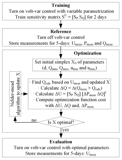The current practice in Europe consists in setting these parameters to fixed values when the PV system is installed. The values are defined in grid connection rules. Many distribution system operators follow the German application rule VDE-AR-N 4105 and mandate the following values . To adapt to the specific environment of each PV system, a new algorithm has been developed in the framework of the SABINA project, which finds out the optimal parameters of volt-var control based on power meter data [26]. The main difficulties when determining these parameters is the need of a whole simulation of the electrical grid, with detailed information regarding network data, PV systems location, and characteristics. These data are usually not available or accessible. The aim of the algorithm is to determine volt-var control optimal parameters without the need of a simulation program to represent the electrical grid. For this reason, a voltage sensitivity matrix is used to represent an approximation of the grid’s topology avoiding the usage of precise network details. The voltage sensitivity matrix is derived from the power flow in Equations (3) and (4), where , , and are the measured active and reactive power and the voltage at node i, respectively, is the real part of the admittance of the line connecting node i to node j, is the imaginary part of the admittance, and is the voltage phase of node i.