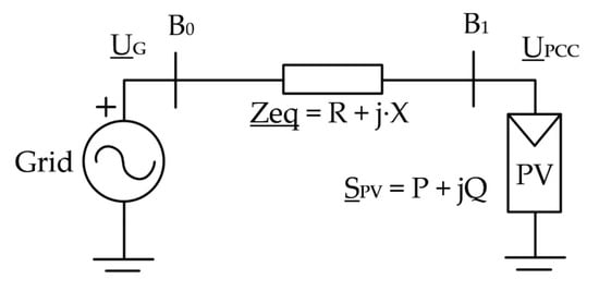 Experimental validation of the volt-var algorithm with actual PV inverters is a shortcoming from previous studies that allows for testing its effective performance, with its behaviour being connected with real communication devices (such as RTUs), and serving as a previous step for deployment at a larger-scale pilot in the same SABINA project, as mentioned in the introduction. Subsequenntly, to test the effectiveness of the reactive power control algorithm in a physical and controlled environment, some simplifications have to be done in terms of LV network representation. A simplified model is used to accurately estimate the magnitude of overvoltage within LV areas with limited data in a small amount of time. Such data are summarized while taking into consideration the impedance of each branch and the parent branch to which they are connected, the load/generator ratings, and the parent connection. This simplification allows representing the LV area with a two-bus model formed by three components: a slack bus with a defined reference voltage, an equivalent network impedance, and a PQ bus for the PV generation. Bus is the slack bus, representing the connection of the grid at a fixed reference voltage , as shown in Figure 3. Bus connects the PV generation () to the grid through an equivalent impedance (). is the maximum voltage in the LV area during tests, which represents the furthest point from the voltage source.