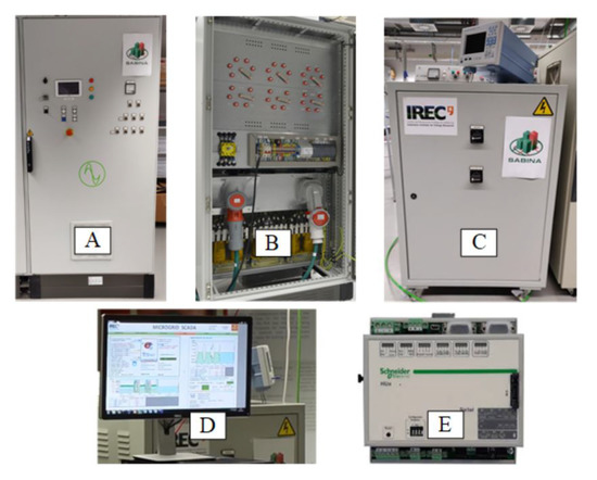 Figure 4. Key components of the experimental setup. (A) Grid emulator, (B) Line emulator, (C) Emulated photovoltaic (PV), (D) Supervisory Control and Data Acquisition (SCADA), and (E) Remote Terminal Units (RTU).- A grid emulator that acts as voltage source setting up the reference voltage and frequency of the emulated microgrid. For the cases in this study, all of the tests are fixed at 400 V and 50 Hz.