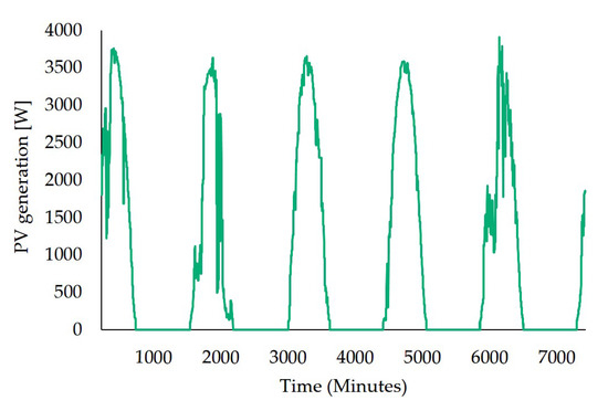 PV generation for a five-day test. The starting point corresponds to 9 a.m.