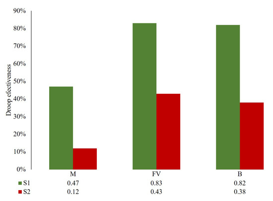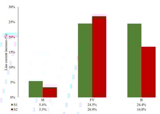 The PV inverter threshold for the reactive power () is another factor that affects the effectiveness of the control system. Lower thresholds of allow more reactive power absorption and, consequently, more current flowing through the lines. The current increase that results from the different scenarios under the three voltage regulation control modes is visible in Figure 10, presenting similar trends to those that were observed in the voltage reduction. That is, the best results are observable using the FV mode in S2, although the current increase in S1 is also close to the 25% for both the FV and B modes. In any case, the M mode presents the less performing response for this indicator (current increase), similarly to what was observable with the droop parameter or the voltage reduction.