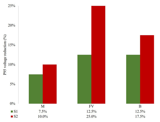 Taking into account that the effectiveness of the control relies on the capacity to reduce voltage at the PV inverter location, Figure 8 shows the 95th percentile of the maximum voltage reduction that was reached at the PCC in relation to the maximum allowed deviation.