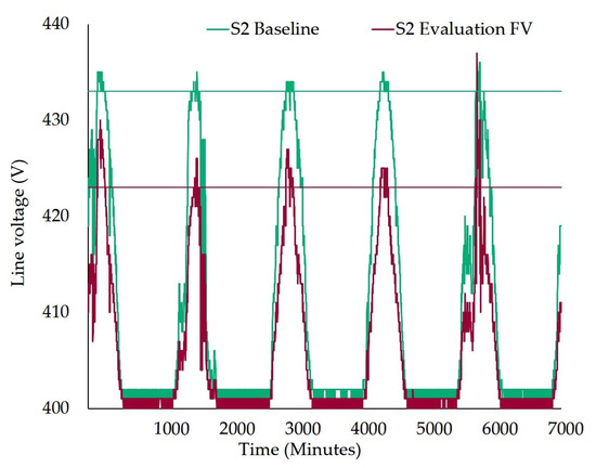 To have a clearer picture of the voltage reduction capacity of the algorithm and how results improve after the two days learning period, Figure 9 plots the monitored voltage of the five-day test for the reference and the evaluation period in S2 using the FV optimization mode. The maximum voltage reduction of 25% is retrieved from the 95th percentile straight lines (green for the reference case and red for the evaluation period).