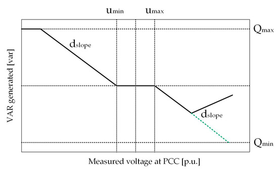 The volt-var control function is characterised by five parameters that are represented in the curve shown in Figure 1. Parameters and represent the inverter’s reactive power capabilities; and determine the dead-band where the reactive power is not exchanged, and d is the droop parameter that corresponds to the slope of the curve. With being the voltage that is measured at the PCC expressed in per unit (p.u.) and the total apparent power of the inverter, the resulting reactive power can be computed, as follows, Equations (1) and (2)):