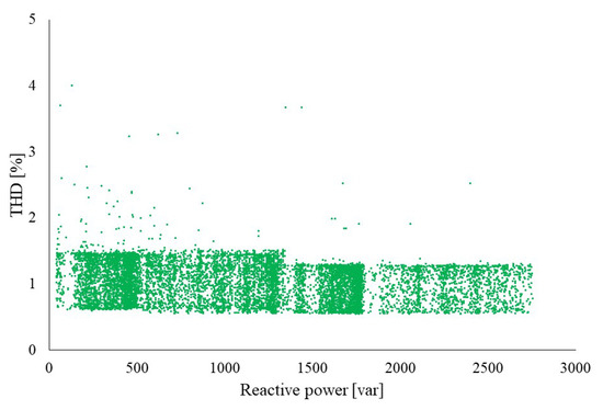 Finally, THD must be less than 5% for general application according to EN50600 standard. During all of the tests, the values remained within the regulation limits, and no correlation is found between the increase of THD and reactive power use of the PV emulator. To demonstrate how far from the limit the tests were, Figure 13 plots the THD and reactive power measured at each minute of the evaluation period of Test 4.