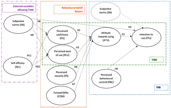 SN is “a person’s perception that most people who are important to him think he should or should not perform the behaviour in question” [57]. Its role is perceived differently in TAM and TRA. In TRA, SN is believed to directly influence ITU, while TAM does not include SN to influence ITU. In TPB, SN is among the three factors that directly affect ITU [64]. This variable may play a significant role when one travels with his or her family members or good friends. The three theoretical components of TPB are merged in the TAM-based model (blue dotted box in Figure 1), in which SN is proposed as a factor directly and indirectly affecting ITU (affecting TAM as an external variable—shown in the purple dotted box).