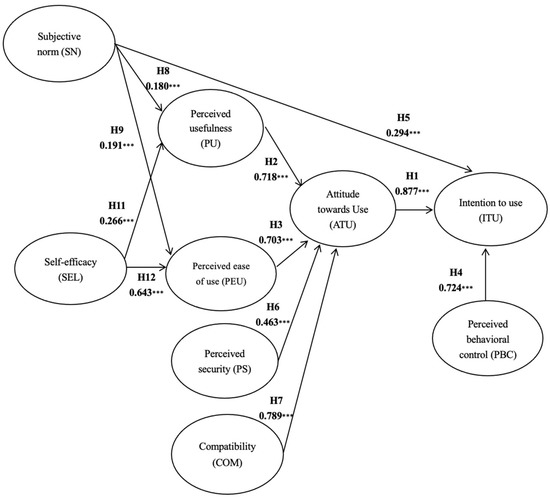 Perceived usefulness (PU), perceived ease of use (PEU), attitude towards use (ATU) and intention to use (ITU) technology are the four theoretical components of TAM. PU refers to the technology users’ belief that new technology improves the performance of a certain task [4] and PEU describes the extent of convenience and effortlessness of using new technology [52,53]. ATU is the emotion and judgement towards using technology; favourable attitude towards new technology results in strong ITU [54,55].