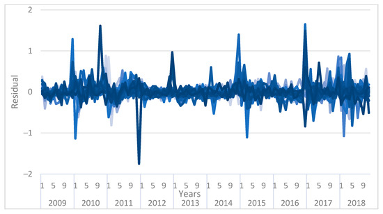 The ARCH model [54] can explain the variety of residual prices used as volatility values. The value commonly used is the logarithmic standard deviation. In the ARCH Equation (3), constant is part of the variety of residue , which is calculated by adding up the residual difference squared from the past value , and the nature of heteroscedasticity is at that stage. This model is still simple, and Equation (4) is used in various residuals depending on the residual squared at several previous values (lag p).