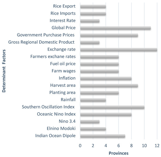 The data show the most dominant influence on the volatility of rice prices in each province (Figure 4). To make it easier to accumulate, the most dominant influencing variables with various determinative factors are not shown here. We can get an overview of the most dominant climate variables and macroeconomic groups that affect rice prices at the provincial level. The results show that the rupiah exchange rate against the dollar dominates the pattern of rice price volatility at the regional level. However, if it is related to local influences, only four provinces have a significant influence. Global rice prices also remain a determinant in influencing price volatility at the national level. Government intervention on prices is considered as one way to control the level of volatility in line with the 10 provinces as a whole group.