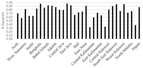 The model can effectively describe rice price volatility in combination with macroeconomic components and climatic conditions, but not all regions are well represented, as seen in Figure 5. Three provinces respond less well to the R-squared value, namely West Kalimantan, North Sulawesi, and West Papua. This was reflected in the climatic factors, because these three regions have unique patterns and the least measurable agriculture components. Provinces that are based on food agriculture show an average value of 70% in the Java Island region, except Banten Province does not respond well. There are two perceptions through the R-squared model: only a few dominant variables influence an area, or most of the variables affect it. The Riau Islands region was influenced predominantly by the value of wages, and Papua by fuel oil price.